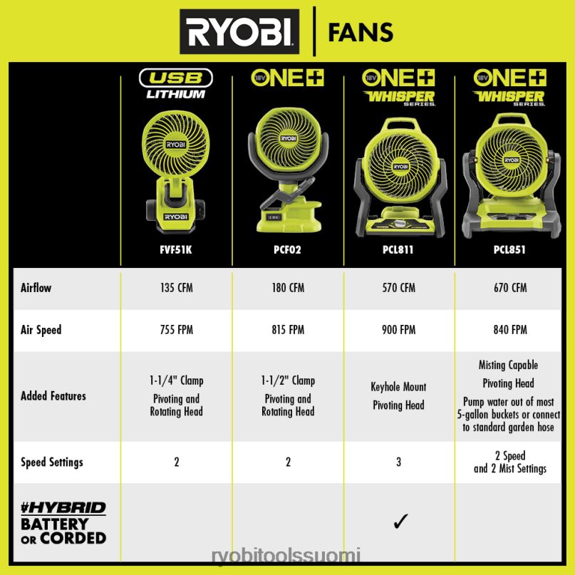 RYOBI 18v one+ hybridi whisper -sarjan 7.5 tuuletin 22224497 valaiseva elämäntapa ja virkistys