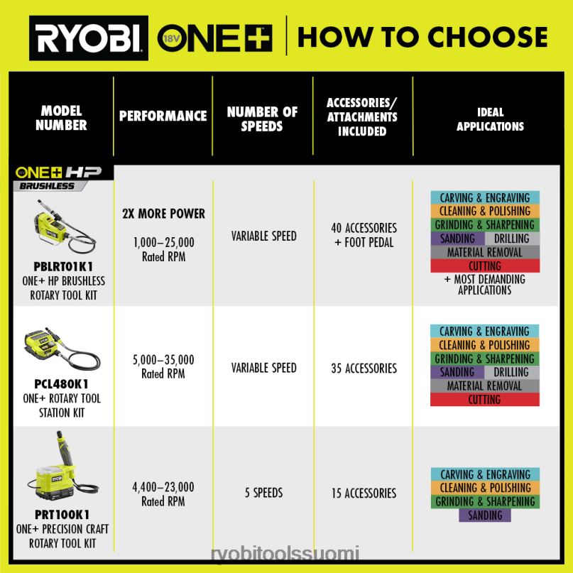 ryobi esittelee 18v one+ pyörivän työkaluaseman. Tämä työkalu tarjoaa tehostettua tehoa säädettävällä nopeudella, jonka avulla käyttäjät voivat valita 5 000 – 35 000 kierrosta minuutissa erilaisten projektien suorittamiseksi. Tämä pyörivä työkaluasema on myös luokkansa hiljaisin, mikä tekee siitä täydellisen käytettäväksi useimmissa työtiloissa. Pyörivä työkaluasema tarjoaa 35 mukana toimitettavan lisävarusteen ja varustevaraston. 36 tuuman joustava varsikynärakenne maksimoi tarkkuuden ja mukavuuden. Tässä työkalussa on myös uusi innovatiivinen pikavaihtoholkki, jossa on 4 kertaa nopeampi tarvikkeiden vaihto, mikä tekee lisävarusteiden vaihtamisesta nopeaa ja helppoa. kumijaloilla, jotka vähentävät liukastumista, ja integroidut riippuvat avaimenreiät, 18v one+ pyörivä työkalu on helppokäyttää ja helppo säilyttää. Tämä pyörivä työkalu sisältää 3 vuoden ryobin valmistajan takuun, ja se sisältää 18v one+ 2ah akun, 18v one+ laturin, 36 tuuman joustavan akselin, 35 hionta-/leikkaus-/hionta-/kiillotustarvikkeita, tarvikkeiden säilytyslaukun, jakoavaimen ja käyttöopas.