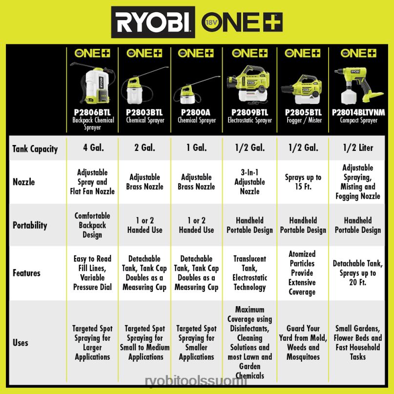 - ruiskuttaa jopa 30 gallonaa latauksella 18v one+ 1,5ah akulla