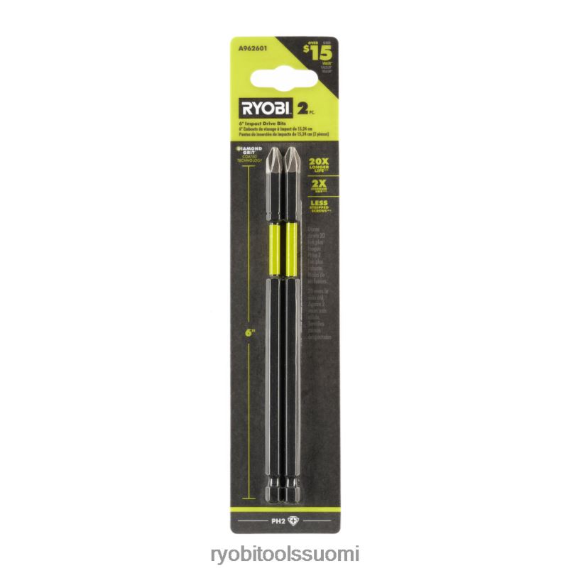 paranna ajovarusteitasi ryobin timanttihiekkapäällysteisellä tekniikalla. ryobi 2 kpl. 6″:n timanttihiekkaisella iskukäyttöterillä on karkaistu kärki, joka parantaa kestävyyttä ja 20x pidemmän käyttöiän. Timanttihiekkapinnoitettu tekniikka pitää myös tiukasti kiinni kiinnittimessä 2x vahvemman otteen ja paremman hallinnan ansiosta, jopa laajemmalla ulottuvuudella. Parannettu kiinnitys tarttuu kiinnittimeen samalla kiristys johtaa vähemmän irrotettuihin ruuveihin. Näissä teräissä on 1/4″ kuusiovarsi, jonka ansiosta ne sopivat suoraan poraistukkaan tai iskuvääntimeen. 6″ terät tarjoavat lisäpituutta vaikeapääsyisiin sovelluksiin. Tämä sarja on täydellinen käyttöteräratkaisu kaikille diyerille ja ammattilaisille, jotka etsivät vähemmän irrotettuja ruuveja ja optimaalista esiajo-ohjausta. täydennä työkaluasikokoelma ensiluokkaisilla ryobi-lisävarusteilla. 2 kpl. 6″:n timanttikarkeudella toimivat iskuterät ovat yhteensopivia tavallisten porien ja iskuvääntimien kanssa, ja ne sisältävät (2) 6″:n ph2-iskuterää.