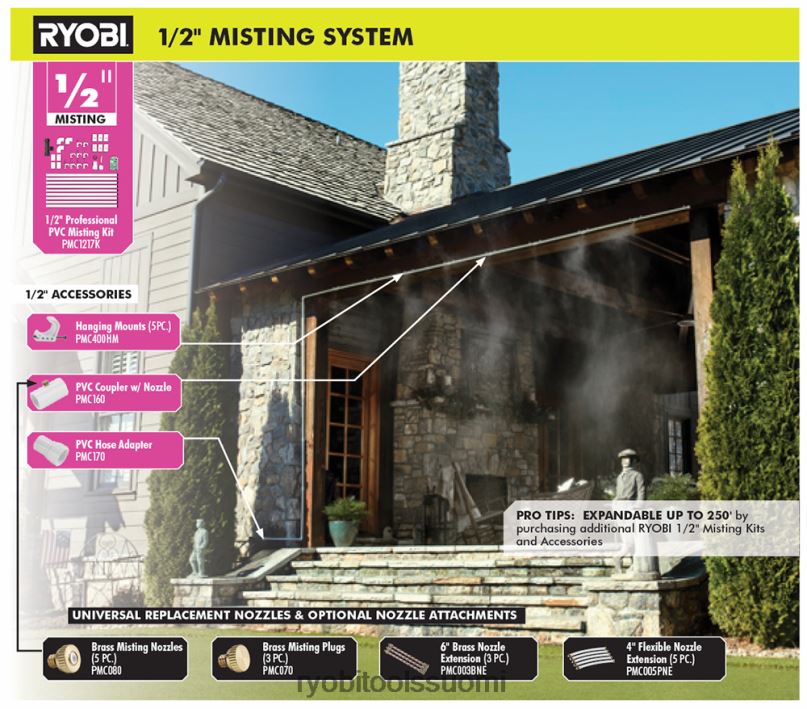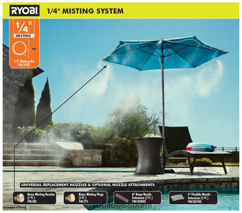 ryobi-sumutussarjat ja -tarvikkeet ovat helpoin ja tehokkain tapa tarjota viileä ja mukava ympäristö, jonka haluat. ryobin 5-pakkaus, jossa on 4 tuumaa joustavat suuttimen jatkeet, voidaan käyttää olemassa olevien sumutussuuttimien sijasta, jotta voit ohjata jäähdytyssumun suunnan minne tahansa. joustavat jatkosuuttimet on erityisesti suunniteltu sopimaan mihin tahansa 10/24-kierteiseen sumutussuuttimen aukkoon, ja niitä voidaan käyttää 1/4 tuuman tai 3/8 tuuman ryobi-sumutusjärjestelmissä. Nämä jatkeet käyttävät vain 1/2 gph per suutin. tämä tuote sekä kaikki muut ryobi-sumutussarjat ja -tarvikkeet on suunniteltu ulkokäyttöön vain kylmän veden kanssa.