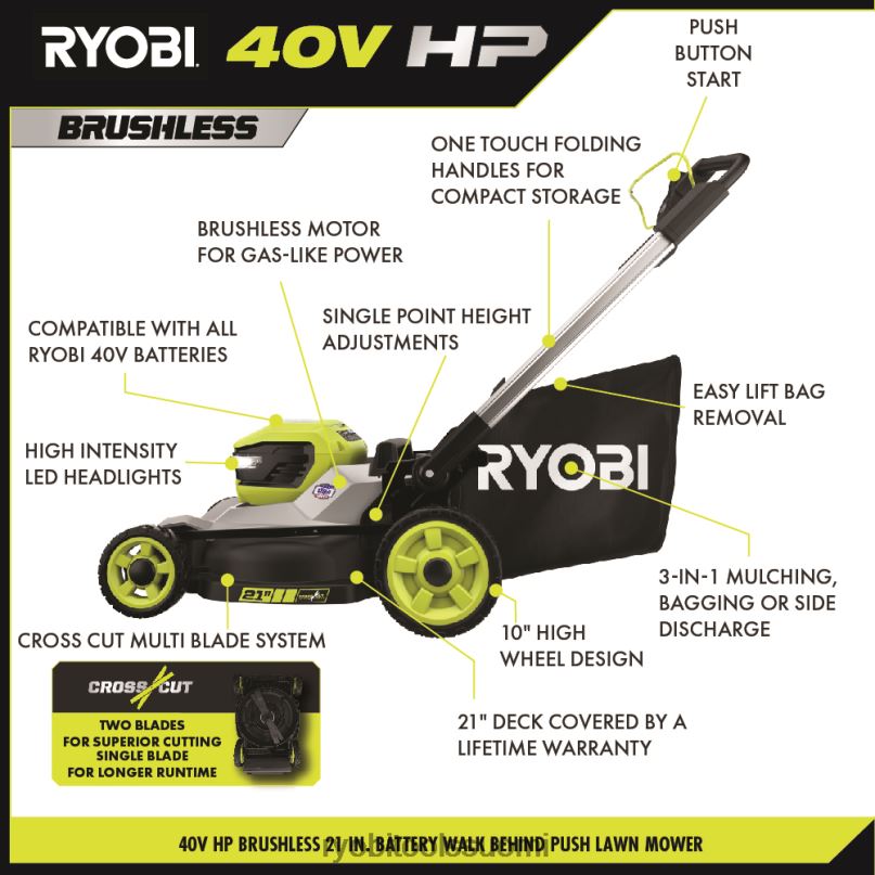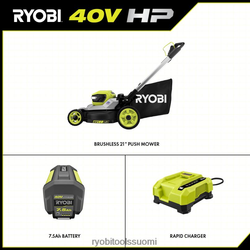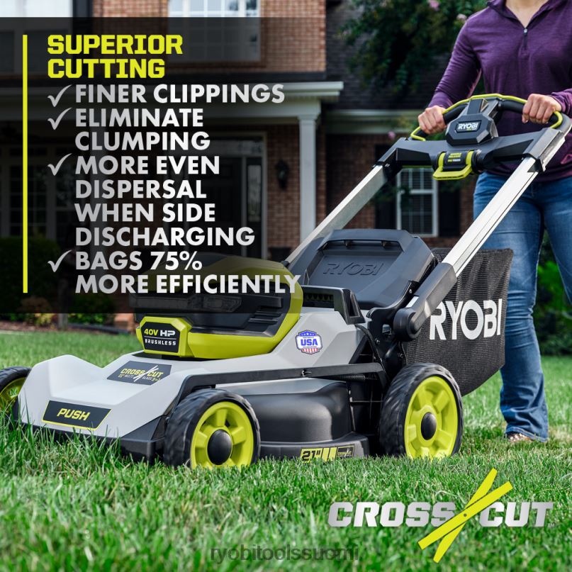 ryobi 40v hp harjaton 21″ moniteräinen akkukäyttöinen ruohonleikkuri tuottaa kaasun tehoa johdoton mukavuudella. Premium hp harjaton moottori tarjoaa enemmän tehoa, pidemmän käyttöajan ja pidemmän moottorin käyttöiän. Se käynnistyy vain napin painalluksella, ilman kaasu-, öljy- tai huoltovaivaa. Tämä ruohonleikkuri on ihanteellinen jopa 1/2 hehtaarin teloille, ja siinä on kaksi aktiiviset akkuportit ja 40 voltin 7,5 ah akku, joka tarjoaa jopa 50 minuutin käyttöajan. Poikittaisleikattu moniteräjärjestelmä tarjoaa kaksi terää erinomaisen leikkaussuorituskyvyn saavuttamiseksi tai yhden terän pidempään käyttöikään. Kestävä 21″ leikkuulaite on kevyt , kestää korroosiota ja sillä on elinikäinen takuu. leikkurissa on suuri 10″ korkea pyörärakenne helpottaa ohjattavuutta ja leikkurissa on 7-pyhden pisteen korkeudensäädöllä voit helposti valita ruohon korkeuden välillä 1,5″ – 4″. 3-in-1-leikkuutoimintojen avulla voit valita pussituksen, silppuamisen tai sivupuhalluksen väliltä. helpon nostoliikkeen pussin poistamisen avulla voit nopeasti ja helposti tyhjentää ruohonkeräyspussin ja yhden kosketuksen alumiinikahvat taitettavat kompaktiin pystysuoraan säilytykseen. Tämä leikkuri sisältää 40 V:n pikalaturin, joka lataa akut 4x nopeammin kuin tavallinen laturi. tämä ruohonleikkuri on ylpeänä valmistettu Yhdysvalloissa maailmanlaajuisista materiaaleista ja sillä on 5 vuoden työkalutakuu.