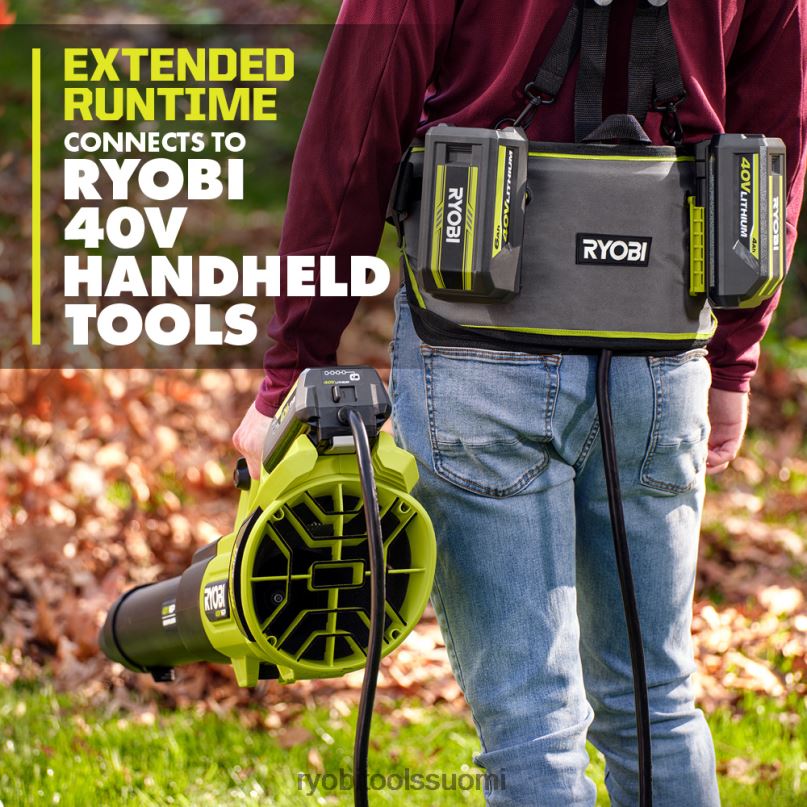 laajenna ryobisi 40 voltin järjestelmääsi 40 voltin hihnavirtalähteellä. Tämä hihnavirtalähde auttaa sinua pidentämään ryobin 40 voltin käsityökalujen käyttöaikaa, sillä ylimääräiset akut ovat rinnallasi, vaikka olisit kaukana kodistasi, autotallistasi tai aitastasi. Käytä virtaa kahdesta aktiivisesta akkuportista kytkemällä 40 voltin sovitin 40 voltin käsityökaluun. vyö vähentää väsymystä poistamalla akkujen painon työkalusta ja siinä on säädettävät olkahihnat, jotka tarjoavat lisätukea, jotta voit työskennellä mukavasti pidempään suurten töiden käsittelyssä. Tämä on erityisen hyödyllistä käytettäessä korkeamman ampeeritunnin akkua työkaluissa, kuten lankaleikkureissa, puhaltimissa, pensasleikkureissa ja moottorisahoissa. kätevä led-merkkivalo adapterissa näyttää akun jäljellä olevan varauksen käytössä javyön taitteet kompaktiin säilytykseen, kun sitä ei käytetä. mikä parasta, se on osa ryobin 40 voltin järjestelmää, jossa mikä tahansa 40 voltin akku toimii minkä tahansa 40 voltin tuotteen kanssa. tällä 40 voltin hihnavirtalähteellä on ryobin 3 vuoden valmistajan takuu, ja se sisältää (1) op40hba 40 voltin hihnavirtalähteen ja käyttöoppaan. akku myydään erikseen.
