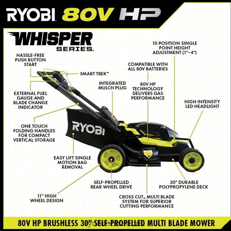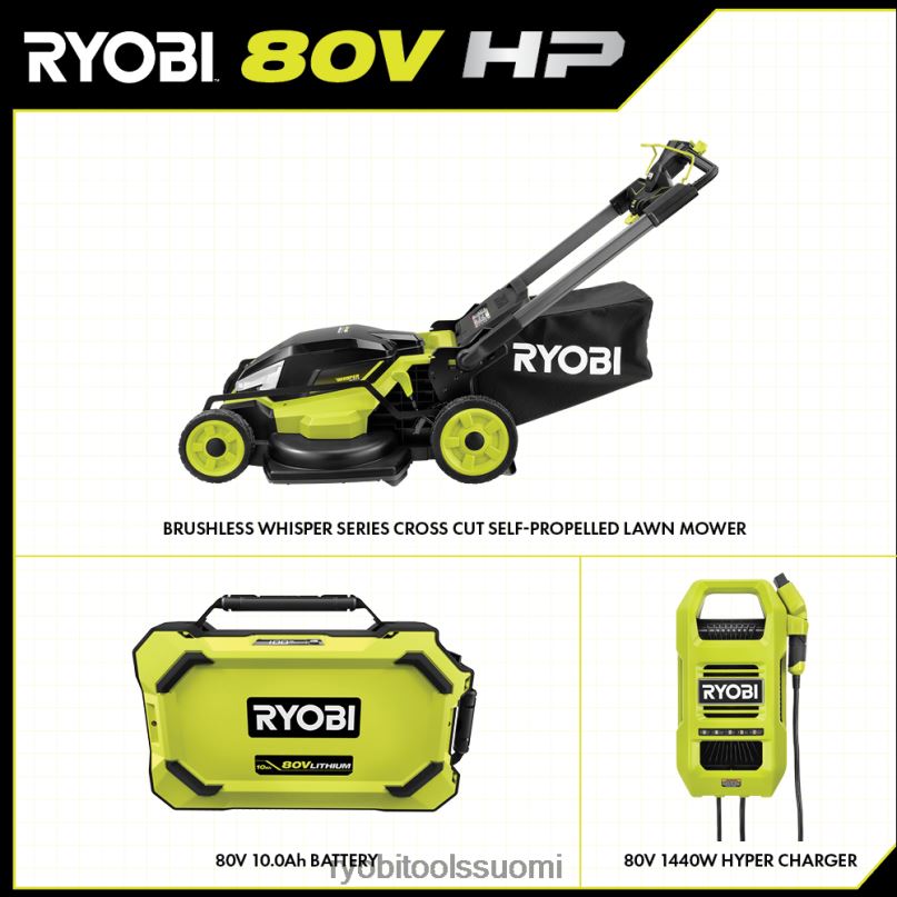 ryobin 80 V hv harjaton 30″ whisper -sarjan poikkileikattu ruohonleikkuri hyödyntää 80 V hv:n tekniikkaa, joka tarjoaa tehokkaamman leikkauskokemuksen kuin kaasulla ryobin 80 V akkuvirralla. 80 V hv:n Teknologia tarjoaa 35 % enemmän tehoa kaasukäyttöön, mikä tekee tästä uudesta 30″ ruohonleikkurista tehokkaamman kuin 223cc kaasuleikkuri. osana whisper-sarjaa, ryobin hiljaisinta tuotevalikoimaa, tämä ruohonleikkuri on 70 % hiljaisempi kuin kaasuleikkuri. Yksinkertaisella painikekäynnistyksellä käyttäjät voivat käsitellä jopa 1 hehtaarin aluetta jopa 90 minuutin käyttöajalla mukana toimitetulla ryobi 80v 10ah litiumakulla. ulkoinen polttoainemittari näyttää akun jäljellä olevan käyttöiän leikattaessa, ja kun on aika ladata, mukana tuleva 80 V hyperlaturi voi ladata akun alle tunnissa. tämä ruohonleikkuri on osa ryobia80v hp harjaton johdoton tuoteperhe. Kun työ on valmis, helppo nostopussin poistaminen tekee leikkuujätteen tyhjentämisestä nopeaa ja kätevää, yhdellä kosketuksella taitettavat kahvat mahdollistavat tämän ruohonleikkurin säilyttämisen helposti poissa tieltä autotallissa tai vajaassa leikkuukertojen välillä. 11″ korkean pyörän muotoilu ja tehokkaat led-ajovalot yhdistettynä whisper-sarjan suunnitteluun antavat käyttäjien leikkaamisen milloin tahansa hämärästä aamunkoittoon. Tällä ruohonleikkurilla on viiden vuoden valmistajan takuu.
