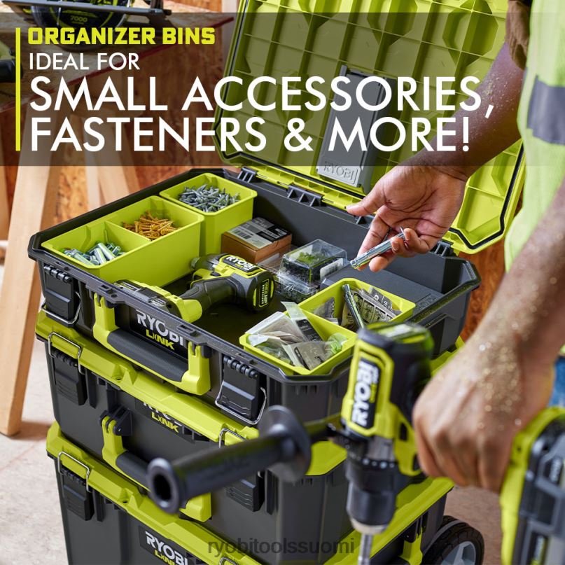 ryobi linkin modulaarinen tallennusjärjestelmä mullistaa varastointialan, ja sen avulla voit järjestää, käyttää ja kuljettaa elämääsi. ryobi link single organor bin sopii ihanteellisesti pienille osille, lisävarusteille, kiinnikkeille, terälle ja trimmerisiimille. tämä roskakori on suunniteltu ripustettavaksi ryobi link -seinäkiskoon tai helposti pakattavaksi ryobi link -työkalulaatikkoon, jotta se on helppo ottaa mukaan. Mikä parasta, se on osa ryobi linkin modulaarista säilytysjärjestelmäsarjaa, joka käyttää samaa lukitustekniikkaa yhdistääksesi mobiili- ja kiinteän tallennustilan tarpeet saumattomasti. omistaa tilasi modulaarisella ryobi link -tallennusjärjestelmällä.
