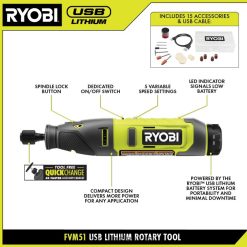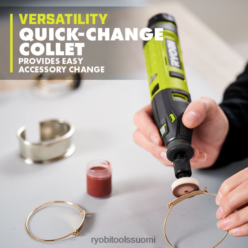 ryobi esittelee pyörivän usb-litiumtyökalun. pyörivässä työkalussa on kompakti rakenne, joka tuottaa enemmän tehoa kaikkiin sovelluksiin. uusi innovatiivinen pikavaihtoholkki, jossa on 4x nopeampi tarvikkeiden vaihto, mikä tekee lisävarusteiden vaihtamisesta nopeaa ja helppoa. Tämän sarjan mukana tulee 15 lisävarustetta erilaisiin sovelluksiin, kuten kaivertamiseen, hiontaan, kiillotukseen ja muihin. Tässä tuotteessa on LED-merkkivalo, joka näyttää, kun akku on ladattu (vihreä) tai akku on vähissä (punainen) käytön aikana. pyörivä usb-litiumtyökalu on osa usb-litiumjärjestelmää, joka tarjoaa kompakteja, kannettavia, ladattavia ratkaisuja johdottomaan tehoon ja tuottavuuteen. tällä pyörivällä usb-litiumtyökalulla on ryobin 2 vuoden valmistajan takuu, ja se sisältää (1) pyörivän työkalun, (1) usb-litiumpariston, (15) lisävarusteita, (1) jakoavaimen,(1) lisävarusteiden säilytyskotelo, (1) usb-kaapeli ja käyttöohjeet.