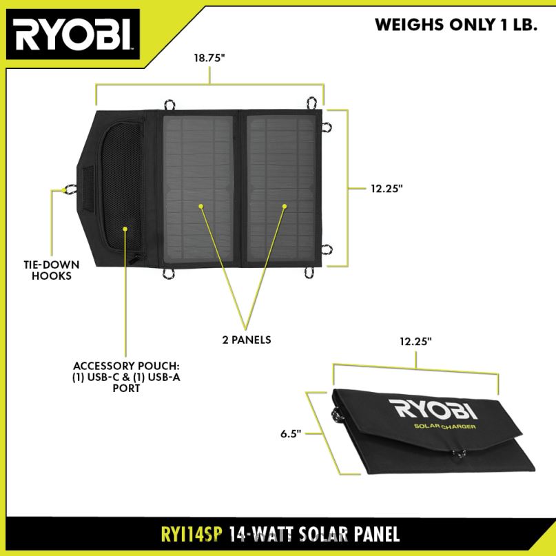 ryobin 14 watin taitettava aurinkopaneeli antaa virtaa kaikille pienille elektronisille laitteille, joissa on usb-a- tai usb-c-portti suoraan auringosta. se on ihanteellinen puhelimien, tablettien, virtapankkien, kaiuttimien ja jopa ryobi 18v one+ -akkujen virransyöttöön, kun se yhdistetään yhteensopivaan ryobi-virtalähteeseen. se lataa ryobi 18v one+ 2ah akun alle 4 tunnissa ja puhelimesi vain 2 tunnissa ja 20 minuutissa. 14 watin aurinkopaneeli maksimoi virtalähteesi siirrettävyyden, painaa vain 1 puntaa ja on kooltaan 12,15 x 6,5 tuumaa taitettuna. Kompakti, kevyt, kokoontaitettava rakenne tekee säilytyksestä ja kuljettamisesta helppoa, joten voit ottaa sen mukaasi laitteiden lataamiseen vaellukselle, retkelle, rannalla ja missä tahansa auringon alla, missä tarvitset kannettavaa virtaa. se voi olla aukiSe voidaan asettaa tasaisesti maahan vangitsemaan valoa auringonvalon huippuaikoina, tai se voidaan kiinnittää useisiin eri kulmiin käyttämällä (7) integroituja ripustuslenkkejä maksimoimaan sen keräämän valon määrän. ryobin 14 watin aurinkopaneelilla on ryobin 3 vuoden valmistajan takuu, ja se sisältää ryi14sp:n 14 watin taitettavan aurinkopaneelin ja käyttöoppaan.