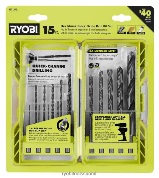 ryobi esittelee 15-osaisen mustaoksidin kuusiokoloporanteräsarjan. Tämä poranterävalikoima soveltuu täydellisesti erilaisille materiaaleille, kuten puu-, metalli- ja muovipinnoille. terät on valmistettu nopeasta teräksestä ja niissä on musta oksidiviimeistely, joka tarjoaa erinomaisen kestävyyden ja 3x pidemmän käyttöiän. Toinen näiden terien ominaisuus on 135 asteen jakopiste, joka poraa kosketuksessa ja estää terääsi kävelemisen. 1/4″ kuusiokoloinen rakenne tarjoaa turvallisen otteen poraistukkoon estäen terän liukumisen. 1/4″ kuusiokolomalli mahdollistaa helpon terän irrottamisen ja nopeaa vaihtoa poran ja käyttöterän välillä. kompakti kotelo helpon pääsyn ja liikkuvuuden takaamiseen. tämä laaja valikoima, 1/16″ – 1/2″, takaa vähän kaikkiin projektisi tarpeisiin. tämä setti sisudes (2) 1/16″ musta oksidiporanterä, (1) 5/64″ musta oksidiporan terä, (1) 3/32″ musta oksidiporanterä, (1) 7/64″ musta oksidiporanterä, ( 2) 1/8″ musta oksidiporan terä, (1) 9/64″ musta oksidiporan terä, (1) 5/32″ musta oksidiporan terä, (1) 3/16″ musta oksidiporan terä, (1) 7/32″ mustaoksidiporanterä, (1) 1/4″ mustaoksidiporan terä, (1) 5/16″ mustaoksidiporan terä, (1) 3/8″ mustaoksidiporan terä ja (1) 1 /2″ mustaoksidiporanterä