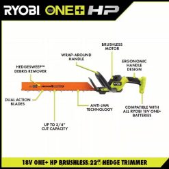paranna ryobi 18v one+ -järjestelmääsi 18v one+ hp 22″ pensasleikkurisarjalla. 18 V hv -tekniikka yhdistää harjattoman moottorin, edistyneen elektroniikan ja korkean suorituskyvyn litiumteknologian, joka tarjoaa 3 200 iskua minuutissa vaivattomaan pensaiden, pensaiden ja pensaiden leikkaamiseen. Nauti jopa 25 minuutin käyttöajasta mukana tulevalla 18 V one+ 2ah litiumakulla. selvitä helposti paksuista pensaista ja oksista 22 tuuman terien ja vaikuttavan “leikkauskapasiteetin” avulla. Tämä yhden+ hp:n pensasleikkuri käyttää tukkeutumisenestotekniikkaa, joka estää teriä juuttumasta kiinni jopa kovimpiin oksiin. koe poikkeuksellisen hyvä suorituskyky jo yhdellä vedolla. liipaisin, ilman kaasun tai johtojen vaivaa. Poista leikkuujätteet helposti trimmaaessasi pensaslakaisujätteenpoistoaineella. plus kaksitoimiset terättehoa pensasaitojen kautta vähentäen tärinää ja vähemmän väsymystä, mikä tekee pihatyöstä helppoa. mikä parasta, se on osa ryobi one+ -järjestelmää – mikä tahansa 18v one+ -akku toimii minkä tahansa 18v one+ -tuotteen kanssa. pensasleikkurilla ja akulla on 3 vuoden valmistajan takuu. Tämä sarja sisältää p2608 18v pensasleikkurin, pbp006 18v 2ah akun, p118b 18v laturin, pensaslakaisujätteenpoistolaitteen, huoran ja käyttöohjeet.