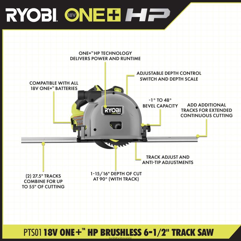 paranna ryobi 18v one+ -järjestelmääsi ryobi 18v one+ hp harjattomalla 6-1/2″ telasahalla. one+ hp -tekniikka yhdistää tehokas harjaton moottori, edistyksellinen elektroniikka ja korkean suorituskyvyn litiumioniakut, jotka mahdollistavat jopa 260 lineaarisen jalan leikkaamisen yhdellä latauksella, kun ne yhdistetään mukana tulevaan 18v one+4ah litiumioniakkuun. Yhdistä (2) 27,5″ mukana tulevat raidat jopa 55″ kontrolloituja, tarkkoja leikkauksia ja lisää telaketjuja pidennettyä jatkuvaa leikkaamista varten. Tällä sahalla voidaan tehdä viistoleikkauksia -1 asteesta 48 asteeseen, ja sen leikkaussyvyys on 1-15/16″ 90 asteen kulmassa (telalla). ). tee hallittuja ja tarkkoja leikkauksia nopeasti jopa 4300 rpm:llä. leikkaa luottavaisesti, koska tämä saha on varustettu säädettävällä syvyydensäätökytkimellä ja syvyysasteikolla tarkan pisteytyksen ja syöksymisen takaamiseksileikkaukset sekä telan säätö ja kaatumisenestosäädöt tasaisen ja tarkan leikkauksen varmistamiseksi. tällä harjattomalla telasahalla on ryobin 3 vuoden valmistajan takuu, ja se sisältää 18v yhden+ hp harjattoman 6-1/2″ telasahan, 40t kovametallikärkisen terän, (2) 27,5″ telat, halkaisuveitsen, telakiristimen, terän jakoavain, telaketjuavain, 18v one+ 4ah korkean suorituskyvyn litiumioniakku, laturi ja käyttöohjeet.
