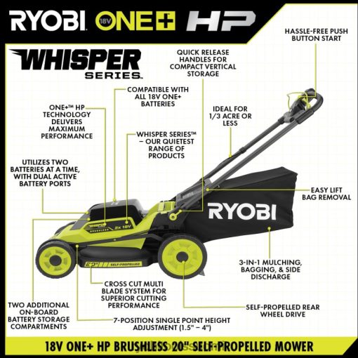 syötä 18v one+ -järjestelmään ryobi one+ 18v hp harjattomalla 20″ itseohjautuvalla moottorikäyttöinen ruohonleikkuri. Vallankumouksellisella one+ hp -tekniikalla toimiva ruohonleikkuri tuottaa enemmän tehoa kuin 150 cc:n kaasuleikkuri, samalla kun se on 60 % hiljaisempi kuin kaasuleikkurit ja vielä hiljaisempi kuin muut akkuleikkurit. Sisältää (4) 18 V one+ 4ah akkua, Tämä ruohonleikkuri tarjoaa jopa 45 minuutin käyttöajan, mikä tekee siitä täydellisen jopa 1/3 hehtaarin nurmikolle. Poikittaisleikattu moniteräjärjestelmä tuottaa erinomaisen leikkaustuloksen ja tuottaa alan parhaan pussituksen, silppuamisen ja sivupuhalluksen. one+ hp -tekniikka yhdistää harjaton moottori, edistynyt elektroniikka ja korkean suorituskyvyn litiumtekniikka, jotka yhdessä lisäävät terän nopeutta ja tehoa vaikeimmilla leikkauksilla, kaikki vain napin painalluksella.nopea itseliikkuva käyttöjärjestelmä varmistaa vaivattoman ja tehokkaan leikkuukokemuksen. Ominaisuuksilla, kuten helposti taitettavat kahvat kompaktia säilytystä varten, yhden pisteen korkeudensäätö ja helposti nostettava pussin poisto, leikkaus ja varastointi eivät ole koskaan olleet helpompaa. mikä parasta, se on osa ryobi 18v one+ -järjestelmää, jossa mikä tahansa 18v one+ akku toimii minkä tahansa 18v one+ -tuotteen kanssa. Sarja sisältää p11011 18v one+ hp harjattoman 20″ ruohonleikkurin, (4) pbp005 18v one+ 4ah litiumakkua, (2) p117 18v one+ pikalaturia, ruohonkeräyspussin, multaa, käynnistysavain, sivupurkauskouru ja käyttöohjeet .
