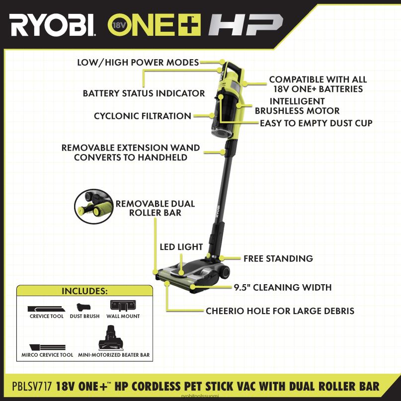ryobi tuo siivouskategoriaamme 18v one+ hp:n johdoton lemmikkipuikkosarja, jossa on kaksoisrullatango. Se tarjoaa johdotonta mukavuutta lattiasta kattoon ulottuvaan siivoukseen. Tämä parannettu puikkoimuri ei vain tuota 2x enemmän imutehoa, vaan on myös 30 % kevyempi ja 50 % hiljaisempi. Kun yhdistät älykkään harjattoman moottorin edistyneeseen elektroniikkaan ja 4 ah:n korkean suorituskyvyn akun, saat imurin, joka toimii pidempään (jopa 60 minuuttia latauksella) ja tehokkaammin. kaksirullainen tanko on valmistettu muhkeasta rullasta ja harjarullasta, joka tarjoaa tehokkaan poiminnan. lisätty muhkea rulla on suunniteltu keräämään roskat tehokkaammin kovilta lattioilta. syklonisuodatin vangitsee jopa 99,9 % pölystä ja allergeenista, mukaan lukien lemmikkieläinten turkikset. rullatangon led-valot valaisevat pölyä, likaa ja hilmaa. helposti tyhjennettävä pölykuppi ja irrotettava rullatanko mahdollistavat pölynimurin nopean puhdistamisen ja huollon. tämä sarja sisältää kaksi lisätarviketta. minimoottoroitu vatkatango antaa käyttäjille tehokkaan imuvoiman pienemmillä pinnoilla, kuten vuodevaatteilla ja verhoilulla. mikrorakotyökalun avulla käyttäjät pääsevät ahtaisiin tiloihin keräämään pieniä pölyhiukkasia. irrottamalla jatkosauvan, sinulla on nyt käsiimuri sotkujen puhdistamiseen autoissa, portaissa, herkillä pinnoilla ja ahtaissa tiloissa mukana tulevalla rakotyökalulla ja pölyharjalla. tämä pölynimuri seisoo yksinään ja sisältää seinätelineen kätevästi säilytettäväksi käytön jälkeen. ryobin 3 vuoden valmistajan takuun tukemana 18v one+ hp:n johdoton lemmikkipuikkoimurisarja, jossa on kaksoisrullatango, sisältää minimoottoroidun vatkaimen, rakotyökalun, mikrorakotyökalun, pölyharjan, seinätelineen, 18v 4ah:n tehokkaan akun, laturin ja käyttöoppaat.