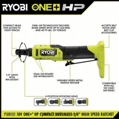 paranna ryobi 18v one+ -järjestelmääsi 18v one+ hp:n kompaktilla harjattomalla 1/4″ nopealla räikkäällä. one+ hp tekniikka tarjoaa enemmän tehoa, käyttöaikaa, kestävyyttä ja nopeutta käyttämällä harjattomia moottoreita, edistynyttä elektroniikkaa ja korkean suorituskyvyn litiumtekniikkaa. Kompakti työkalumme ovat kevyimpiä ja pienimpiä koskaan valmistamiamme, mutta tarjoavat silti optimaalisen tehon työn suorittamiseen. Ihanteellinen kaikkiin autoihin harrastaja tai teknikko, tämä räikkä pystyy toimimaan 2x suuremmalla nopeudella jopa 460 rpm. Yhdistäen 40 ft-lbs vääntömomentin ansiosta tästä työkalusta tulee paras ajansäästö toistuvien tehtävien suorittamisessa, mikä nopeuttaa projektin valmistumista. 20 % kompaktimpi 4-asentoinen pyörivä räikkäpää kahdella sisäänrakennetulla ledillä wtai valot, tämä räikkä voi ulottua mihin tahansa mutteriin tai pulttiin valaistussa työtilassa. säädettävän nopeuden metallinen siipipään liipaisin on helposti saatavilla useista eri kahvoista ja kulmista. säädettävän nopeuden metallinen siipipään liipaisin on helposti saatavilla useista eri kahvoista ja kulmista. tällä 18v one+ hp kompaktilla harjattomalla 1/4″ nopealla räikkällä on ryobin 3 vuoden valmistajan takuu, ja se sisältää (1) psbrc02 18v kompaktin harjattoman 1/4″ nopean räikkälaitteen ja käyttöoppaan. mikä parasta, se on osa ryobi 18v one+ -järjestelmää, jossa on yli 280 langatonta tuotetta, jotka kaikki toimivat samalla akkualustalla. mukana 2ah akku ja laturi.