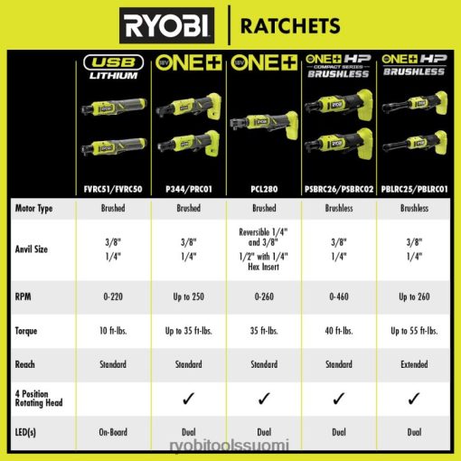 paranna ryobi 18v one+ -järjestelmääsi 18v one+ hp:n kompaktilla harjattomalla 1/4″ nopealla räikkäällä. one+ hp tekniikka tarjoaa enemmän tehoa, käyttöaikaa, kestävyyttä ja nopeutta käyttämällä harjattomia moottoreita, edistynyttä elektroniikkaa ja korkean suorituskyvyn litiumtekniikkaa. Kompakti työkalumme ovat kevyimpiä ja pienimpiä koskaan valmistamiamme, mutta tarjoavat silti optimaalisen tehon työn suorittamiseen. Ihanteellinen kaikkiin autoihin harrastaja tai teknikko, tämä räikkä pystyy toimimaan 2x suuremmalla nopeudella jopa 460 rpm. Yhdistäen 40 ft-lbs vääntömomentin ansiosta tästä työkalusta tulee paras ajansäästö toistuvien tehtävien suorittamisessa, mikä nopeuttaa projektin valmistumista. 20 % kompaktimpi 4-asentoinen pyörivä räikkäpää kahdella sisäänrakennetulla ledillä wtai valot, tämä räikkä voi ulottua mihin tahansa mutteriin tai pulttiin valaistussa työtilassa. säädettävän nopeuden metallinen siipipään liipaisin on helposti saatavilla useista eri kahvoista ja kulmista. säädettävän nopeuden metallinen siipipään liipaisin on helposti saatavilla useista eri kahvoista ja kulmista. tällä 18v one+ hp kompaktilla harjattomalla 1/4″ nopealla räikkällä on ryobin 3 vuoden valmistajan takuu, ja se sisältää (1) psbrc02 18v kompaktin harjattoman 1/4″ nopean räikkälaitteen ja käyttöoppaan. mikä parasta, se on osa ryobi 18v one+ -järjestelmää, jossa on yli 280 langatonta tuotetta, jotka kaikki toimivat samalla akkualustalla. mukana 2ah akku ja laturi.