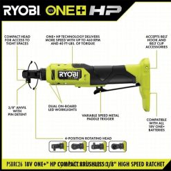 paranna ryobi 18v one+ -järjestelmääsi 18v one+ hp:n kompaktilla harjattomalla 3/8 tuuman nopealla räikkäällä . one+ hp -tekniikka tarjoaa enemmän tehoa, käyttöaikaa, kestävyyttä ja nopeutta käyttämällä harjattomia moottoreita, edistynyttä elektroniikkaa ja korkeaa suorituskykyä litiumtekniikkaa. Kompaktit työkalumme ovat kevyimmät ja pienimmät, joita olemme koskaan valmistaneet, mutta tarjoavat silti optimaalisen tehon työn suorittamiseen. Tämä räikkä on ihanteellinen kaikille autoharrastajille tai ammattiteknikoille, ja se pystyy nostamaan 2x suuremman nopeuden jopa 460 rpm. yhdistä se 40 ft-lbs:n kanssa. vääntömomentin ansiosta tästä työkalusta tulee lopullinen ajansäästö toistuvien tehtävien suorittamisessa, mikä nopeuttaa projektin valmistumista. siinä on 20 % kompaktimpi 4-asentoinen pyörivä räikkäpää, jossa on kaksi sisäänrakennettua lediätyövalot, tämä räikkä voi ulottua mihin tahansa mutteriin tai pulttiin valaistussa työtilassa. säädettävän nopeuden metallinen siipipään liipaisin on helposti saatavilla useista eri kahvoista ja kulmista. tällä 18v one+ hp kompaktilla harjattomalla 3/8″ nopealla räikkäällä on ryobin 3 vuoden valmistajan takuu, ja se sisältää (1) psbrc26 18v kompaktin harjattoman 3/8″ nopean räikin ja käyttöoppaan. mikä parasta, se on osa ryobi 18v one+ -järjestelmää, jossa on yli 260 langatonta tuotetta, jotka kaikki toimivat samalla akkualustalla. Mukana 2 ah akku ja laturi.