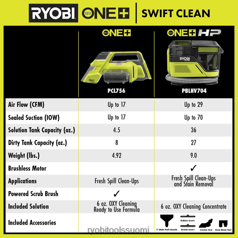 paranna ryobi 18v one+ -järjestelmääsi keskikokoisella 18v one+ hp swiftclean -pistepuhdistussarjalla, joka on erinomainen johdoton puhdistusratkaisu koville tahroille. one+ hp -tekniikka tarjoaa enemmän imutehoa ja pidemmän käyttöajan käyttämällä älykkäitä harjattomia moottoreita, edistynyttä elektroniikkaa ja tehokkaita akkuja. 4 kertaa suuremmalla imuteholla tämä pistepuhdistusaine tarjoaa luokkansa parhaan suorituskyvyn, jota tarvitset pinttyneiden tahrojen poistamiseen. Mukana olevien lisävarusteiden laajan valikoiman ansiosta voit nauttia parannetusta monipuolisuudesta mihin tahansa siivoustöihin. 7″ leveä polku suutin on ihanteellinen suurille tahroille, ja siinä on kaksi sisäosaa. harjaosa on ihanteellinen nopeaan puhdistukseen, kun taas kumiosa sopii ihanteellisesti kiinnittyville tahroille. Yksityiskohtien puhdistukseen ahtaissa tiloissa, rakotyökalu on täydellinen lisävaruste.4′ letku antaa sinulle laajemman ulottuvuuden puhdistuksen aikana, ja letkunhuuhtelutyökalu tarjoaa vaivattoman huollon pitääkseen nopean puhdistuksen paikanpuhdistuslaitteen huippukunnossa. mukana toimitettu ryobi 6 oz. oxy-puhdistustiiviste poistaa tehokkaat tahrat, mikä auttaa sinua saamaan työt valmiiksi nopeasti. mikä parasta, se on osa ryobi one+ -järjestelmää, jossa mikä tahansa 18v one+ -akku toimii minkä tahansa 18v one+ -tuotteen kanssa. tällä 18v one+ hp swiftclean keskikokoisella spot-puhdistussarjalla on ryobin 3 vuoden valmistajan takuu, ja se sisältää tehokkaan 18v 4ah litiumakun, laturin, 6 unssia. pullo ryobi oxy -puhdistustiivistettä, 7″ leveä suutin, harjassisäke, kumiosa, rakotyökalu, letkunhuuhtelutyökalu ja käyttöohjeet.