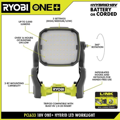 laajenna ryobi 18v one+ -järjestelmääsi ryobi 18v hybrid led -työvalolla. Tämä valaisin on varustettu 3 000 lumenin led-valoteholla, sillä siinä on kaikki työn tekemiseen tarvitsemasi teho. Hybriditekniikka mahdollistaa jopa 16 tunnin käyttöajan alhaisella tai rajoittamattomalla käyttöajalla, kun sitä käytetään jatkojohdon kanssa, joten voit työskennellä niin kauan kuin tarvitset. organisoi, käytä ja kuljeta helposti ryobin linkkiseinällä ja mobiilitallennusjärjestelmällä linkkiyhteensopivalla alustalla. siinä on useita haluttuja kiinnitysvaihtoehtoja, kuten 2-by-asennusmahdollisuus, jalustakiinnitys, integroidut koukut ja avaimenreiät. Käytä tämän työvalon 3 asetusta (korkea/keskitaso/matala) ja 360 asteen kiertoa tarjotaksesi tarkan led-valon tehon siellä, missä sitä tarvitaan. mikä parasta, seon osa ryobi one+ -järjestelmää, jossa on yli 280 langatonta tuotetta, jotka kaikki toimivat samalla akkualustalla. tällä ryobi 18v one+ hybrid led -työvalolla on ryobin 3 vuoden valmistajan takuu, ja se sisältää (1) pcl633 18v one+ hybridi led-työvalon ja käyttöoppaan. akku ja laturi myydään erikseen.