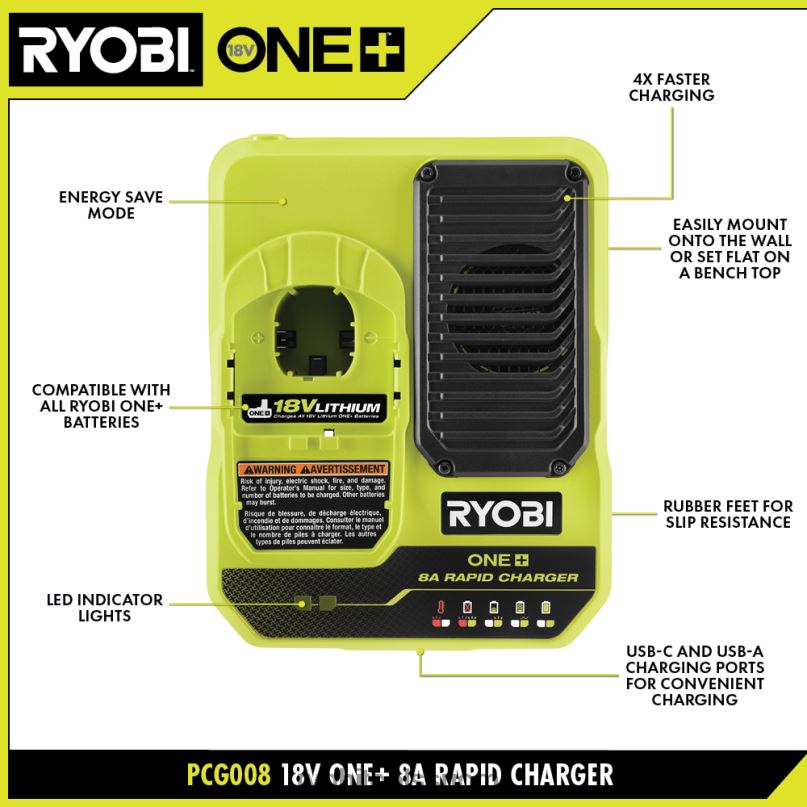 laajenna ryobi 18v one+ -järjestelmääsi ryobi 18v one+ 8a -pikalaturilla. lataus on tehty nopeammin kuin koskaan ennen. 4x nopeampi lataus kuin pcg002, tämä laturi lyhentää seisokkiaikoja merkittävästi, jolloin käyttäjät voivat ladata 8ah korkean suorituskyvyn litiumakun alle tunnissa. LED-merkkivalojen ansiosta käyttäjät voivat helposti tunnistaa akun lataustilan. usb-c- ja usb-a-latausporttien avulla käyttäjät voivat ladata kannettavan elektroniikkansa kätevästi. kumijalat tarjoavat liukastumista estävän alustan estämään laturiasi liukumasta työtilassasi. energiansäästötila säästää energiaa, kun akkuja ei ladata tai huoltaa. työtilan maksimoimiseksi seinäkiinnitys mahdollistaa organisoinnin missä tahansa kohdassa. mikä parasta, se on osa ryobi 18v one+ -järjestelmää, jossa on yli 280 yhteistyötärdless-tuotteita, jotka kaikki toimivat samalla akkualustalla. tällä 18v one+ 8a -pikalaturilla on ryobin 3 vuoden valmistajan takuu, ja se sisältää (1) pcg008 18v 8a -pikalaturin ja käyttöoppaan. akku myydään erikseen.
