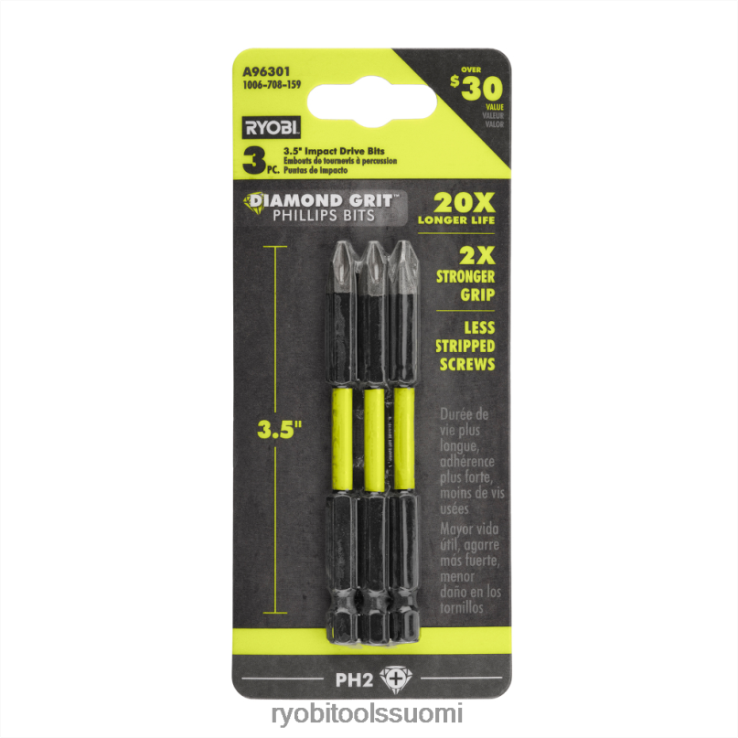 täydennä työkalukokoelmaasi ryobin timanttihiekkapinnoitetekniikalla. nämä 3 kpl. 3-1/2″ iskuvetoterät sisältävät timanttihiekkapinnoitettua tekniikkaa. Timanttihiekkapinnoitettu tekniikka tarjoaa lisäsuojakerroksen 20x pidemmälle käyttöikään, mikä parantaa terän kestävyyttä kaikissa ristipääruuvinvääntösovelluksissa. Timanttihiekka tuottaa 2x vahvemman otteen, joka mahdollistaa vahvan pidon ennen ajoa ja kiinnittimen asettumisen terään. Tämä lisätty pito luo samanlaisen kokemuksen kuin magneettisesti ladattu terä, mutta varmempi pito. Timanttihiekkapinnoitettu tekniikka tarttuu Phillips-kiinnikkeeseen ajon aikana paremman istuvuuden estämiseksi phillips-pään irtoamisen estämiseksi. Tämä sarja on täydellinen käyttöteräratkaisu kaikille diyers ja ammattilaiset etsivät vähemmän irrotettua ruuvin turhautumista ja optimaalista esiajo-ohjausta. nämä 3 kpl. 3-1/2″ iskukoneistoterät ovat yhteensopivia tavallisten porien ja iskuvääntimien kanssa, ja ne sisältävät (3) 3-1/2″ timanttiterää ph2.