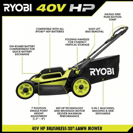 syötä 40 V järjestelmään ryobin 40 V hv:n harjattomalla 20″ työntöruohonleikkurilla. 40 V hv:n tekniikalla tämä leikkuri tuottaa enemmän tehoa kuin 150 cc:n kaasuleikkuri, mukana toimitettu 40 V 6 ah litiumakku tarjoaa jopa 48 minuutin käyttöajan, mikä tekee siitä ihanteellisen jopa 1/2 hehtaarin alueelle. 40 V hv:n tekniikka yhdistää harjattoman moottorin, edistyneen elektroniikan ja litiumakut, jotka reagoivat automaattisesti leikkuuolosuhteisiin ja lisäävät terää nopeus, joka eliminoi tukkeutumisen ja teho kovimman leikkauksen kautta. Yhden pisteen korkeudensäätö mahdollistaa nopean nurmikollesi täydellisen korkeuden valinnan, kun taas yhdellä kosketuksella taitettavat kahvat helpottavat säilytystä ahtaissakin paikoissa. koe kaasuteho vain napin painalluksella. mikä parasta, se on osa ryobi 40v -järjestelmää wtässä mikä tahansa 40 V akku toimii minkä tahansa 40 V tuotteen kanssa. tällä ruohonleikkurilla on ryobin 5 vuoden valmistajan työkalutakuu, 3 vuoden valmistajan akkutakuu, ja se sisältää ry401017 40v hv harjattoman 20″ työntöleikkurin, op40605 40v 6ah litiumakun, op408 40v pikalaturi, ruohoavaimen laukku , multaamistulppa, sivupoistokouru ja käyttöohjeet.