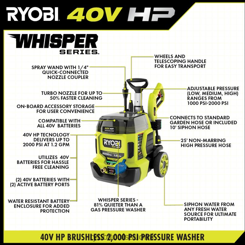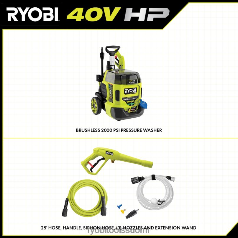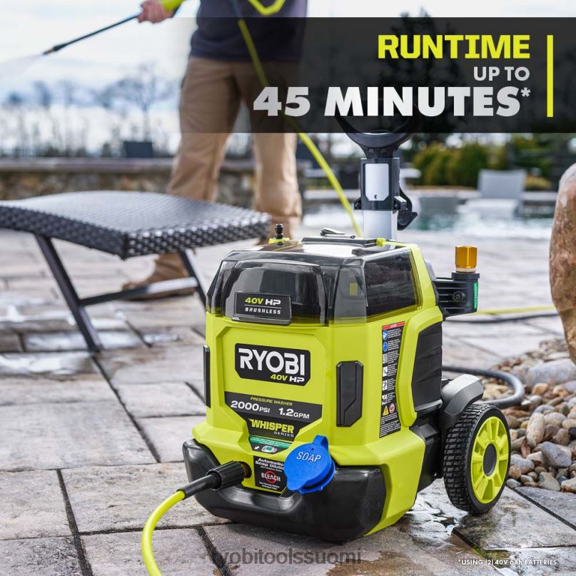 paranna 40v järjestelmääsi ryobin 40v hv painepesurilla. Edistynyt 40 V hv -tekniikka käyttää harjatonta moottoria, edistynyttä elektroniikkaa ja litiumakkua, joka tuottaa jopa 2 000 psi:n ja 1,2 gpm:n, joten tämä tehopuhdistusaine sopii täydellisesti talon sivuraideiden, veneiden, jalkakäytävien, ajotietien ja terassien puhdistamiseen. koe tehokas, kannettava puhdistus ilman kaasua, huoltoa ja vaivaa. teho voidaan säätää kolmeen eri tehoasetukseen välillä 1 000-2 000 psi, joten tämä painepesuri on ihanteellinen sekä herkkien että vaativien puhdistustöiden suorittamiseen. harjaton moottori ja litiumtekniikka tarjoavat jopa 45 minuutin käyttöajan (2) 40v 6ah akulla. tämä whisper-sarjan painepesuri on suunniteltu olemaan 81 % hiljaisempi kuin gpainepesureina, joiden avulla voit puhdistaa mihin aikaan päivästä tahansa häiritsemättä muita. paranna painepesuriasi ry31012vnm 12″ pinnanpuhdistusaineella nopeaan, juovattomaan puhdistukseen, ry31211-vesiharjalla tehokkaaseen lian ja roskien poistoon ja ry31f04-vaahtopuhdistimella hallitun vaahtopesuaineen annostelemiseen. Mikä parasta, se on osa ryobi 40v:tä järjestelmä, jossa mikä tahansa 40 V:n akku toimii minkä tahansa 40 V:n tuotteen kanssa. Tällä 40 V:n painepesurilla on ryobin 5 vuoden takuu letku, 10″ sifoniletku, suuttimet (15 astetta, saippua ja turbo), itseimevä sovitin ja käyttöohje. akku ja laturi myydään erikseen.
