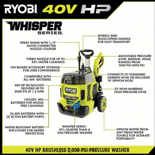 paranna 40v järjestelmääsi ryobin 40v hv painepesurilla. Edistynyt 40 V hv -tekniikka käyttää harjatonta moottoria, edistynyttä elektroniikkaa ja litiumakkua, joka tuottaa jopa 2 000 psi:n ja 1,2 gpm:n, joten tämä tehopuhdistusaine sopii täydellisesti talon sivuraideiden, veneiden, jalkakäytävien, ajotietien ja terassien puhdistamiseen. koe tehokas, kannettava puhdistus ilman kaasua, huoltoa ja vaivaa. teho voidaan säätää kolmeen eri tehoasetukseen välillä 1 000-2 000 psi, joten tämä painepesuri on ihanteellinen sekä herkkien että vaativien puhdistustöiden suorittamiseen. harjaton moottori ja litiumtekniikka tarjoavat jopa 45 minuutin käyttöajan (2) 40v 6ah akulla. tämä whisper-sarjan painepesuri on suunniteltu olemaan 81 % hiljaisempi kuin gpainepesureina, joiden avulla voit puhdistaa mihin aikaan päivästä tahansa häiritsemättä muita. paranna painepesuriasi ry31012vnm 12″ pinnanpuhdistusaineella nopeaan, juovattomaan puhdistukseen, ry31211-vesiharjalla tehokkaaseen lian ja roskien poistoon ja ry31f04-vaahtopuhdistimella hallitun vaahtopesuaineen annostelemiseen. Mikä parasta, se on osa ryobi 40v:tä järjestelmä, jossa mikä tahansa 40 V:n akku toimii minkä tahansa 40 V:n tuotteen kanssa. Tällä 40 V:n painepesurilla on ryobin 5 vuoden takuu letku, 10″ sifoniletku, suuttimet (15 astetta, saippua ja turbo), itseimevä sovitin ja käyttöohje. akku ja laturi myydään erikseen.