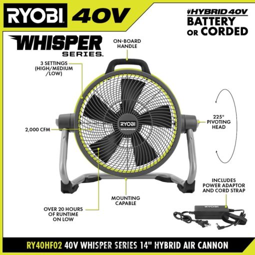 laajenna ryobi 40v -järjestelmääsi ryobi 40v hybrid whisper -sarjan 14″ ilmatykillä. Tässä tuulettimessa on maksimaalinen jäähdytys yli 2 000 cfm:llä ja se on myös osa whisper-sarjaamme : osa hiljaisinta tuotevalikoimaamme, joka hyödyntää edistynyttä tekniikkaa melun vähentämiseksi. Mukauta ilmavirtaasi 3 asetuksella (korkea/keskitaso/matala), 225 astetta kääntyvä pää ja asennusvaihtoehdot tarkkaan ilmansijoitteluun joka kerta. Lisäbonuksena, hyödynnä mukana toimitettu piippupistokevirtasovitin (integroidulla johtohihnalla) tarjoaa rajoittamattoman käyttöajan. Tällä 40 V hybridi whisper -sarjan 14″ ilmatykillä on ryobin 3 vuoden valmistajan takuu ja se sisältää (1) ry40hf02 40 V hybridi whisper -sarjan 14″ ilmatykin tuuletin, (1) piippupistoke virtasovitin ja käyttöopas akku ja charger myydään erikseen.
