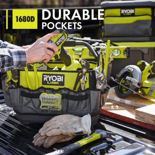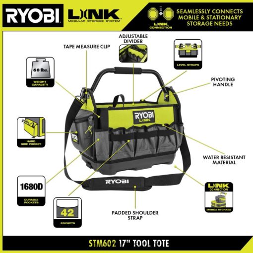 ryobi linkin modulaarinen säilytysjärjestelmä mullistaa varastointialan, ja sen avulla voit järjestää, käyttää ja kuljettaa elämääsi. ryobi link 17″ työkalulaukku on suunniteltu selviytymään vaikeimmistakin tilanteista. 60 lb. painokapasiteetti, raskaat 1680d taskut ja vedenpitävä materiaali pitävät työkalut suojattuna kuljetuksen aikana. Järjestely on loputon 42 sisä- ja ulkotaskulla sekä säädettävällä jakaja. kova sivutasku tarjoaa lisäsuojaa puhelimille tai laseille, kun taas integroidut tasohihnat ja mittanauha pitävät tavarat helposti ulottuvilla. Kanna yläkahvasta tai mukana tulevasta pehmustetusta olkahihnasta. Kääntyvä kahva voidaan helposti säilyttää mikä parasta, se on osa modulaarista ryobi link -varastoaJärjestelmäsarja tuotteita, jotka käyttävät samaa lukitustekniikkaa yhdistämään saumattomasti mobiili- ja kiinteän säilytystarpeesi. omistaa tilasi modulaarisella ryobi link -tallennusjärjestelmällä.