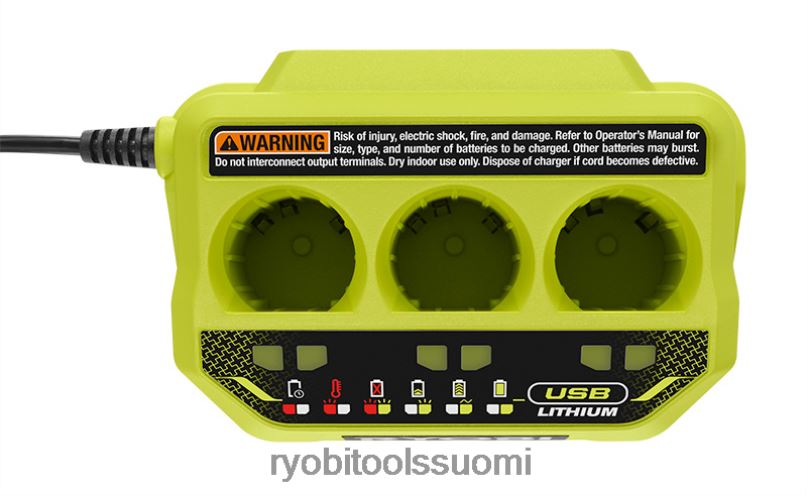 laajenna ryobi-usb-litiumjärjestelmääsi litium-usb-3-porttisella laturilla. Jopa 80 % nopeampi lataus kuin ryobin usb-kaapelilla tämä laturi lyhentää seisokkeja merkittävästi. tehty mukavuutta ajatellen, se voi ladata ja ylläpitää peräkkäin jopa 3 usb-litiumparistoa. LED-merkkivalojen ansiosta käyttäjät voivat helposti tunnistaa akun lataustilan. energiansäästötila säästää energiaa, kun akkuja ei ladata tai huoltaa. työtilan maksimoimiseksi seinäkiinnitys mahdollistaa organisoinnin missä tahansa kohdassa. mikä parasta, se on osa usb-litiumjärjestelmää, joka tarjoaa kompakteja, kannettavia, ladattavia ratkaisuja johdottomaan tehoon ja tuottavuuteen. tällä 3-porttisella litium-usb-laturilla on ryobin 2 vuoden valmistajan takuu, ja se sisältää (1) fvch01 usb litium 3-porttisen laturinja käyttöopas. akku myydään erikseen.